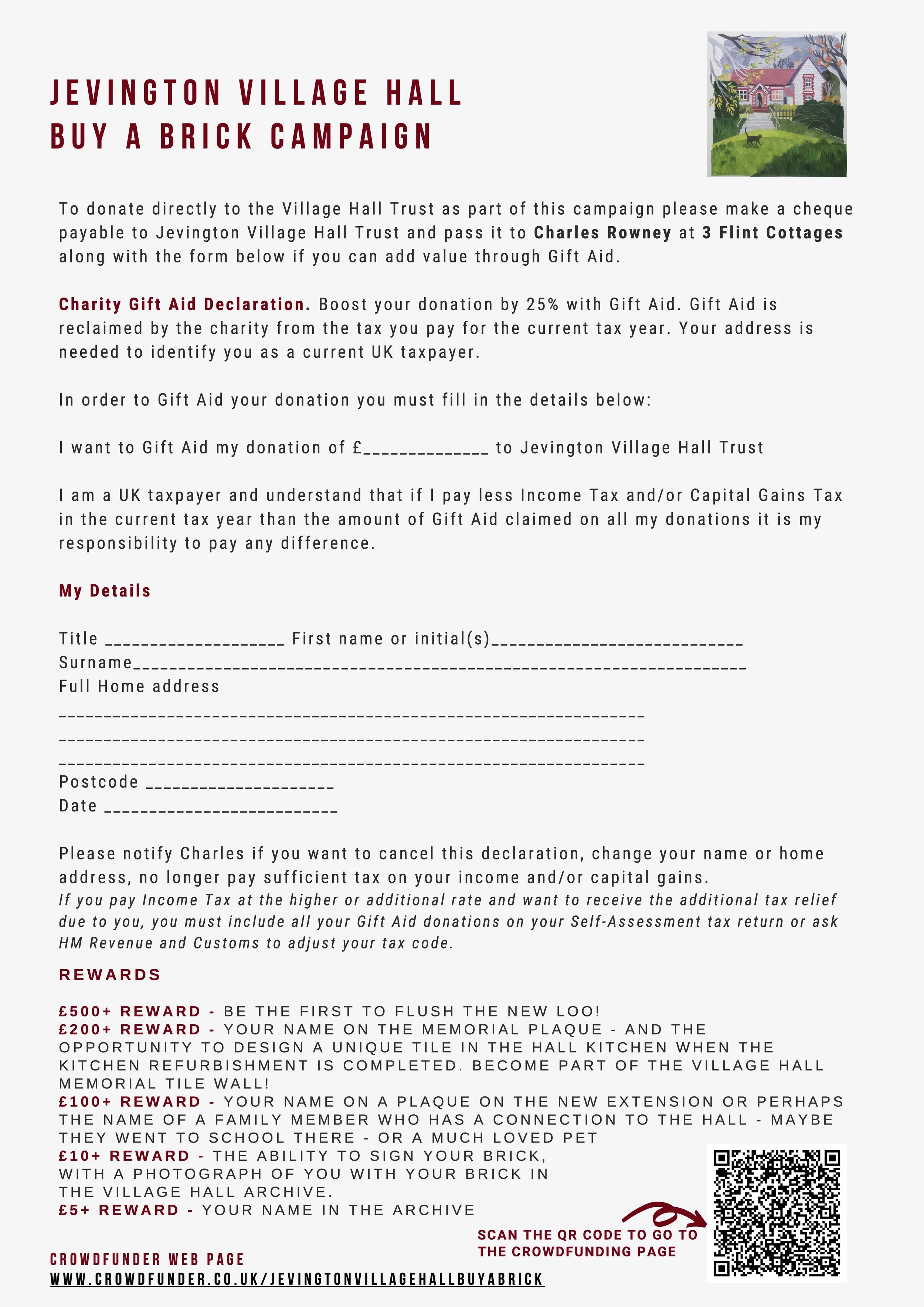 To donate directly to the Village Hall Trust as part of this campaign please make a cheque payable to Jevington Village Hall Trust and pass it to Charles Rowney at 3 Flint Cottages, Jevington along with the form below if you can add value through Gift Aid.